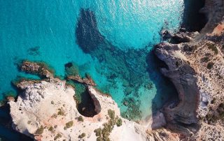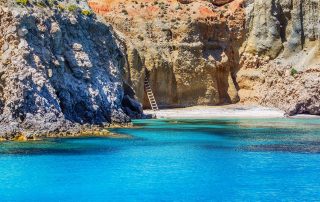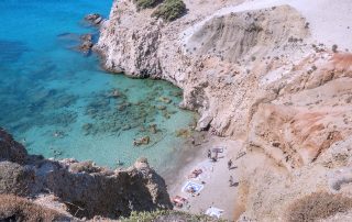 Παραλία αγκαλιασμένη από θεόρατα βράχια, με κάτασπρη άμμο και σμαραγδένια νερά.