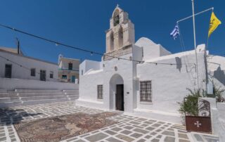 Αρχικά είχε δημιουργηθεί για να λειτουργήσει ως μοναστήρι με το όνομα της Παναγίας της Θεοφανής, αλλά το 1839 την αγόρασαν Κρήτες πρόσφυγες και την έκαναν την εκκλησία του χωριού τους. Οι άκρες και τα τόξα του καμπαναριού της είναι επηρεασμένα από τα γοτθικά, ενώ τα υπέρθυρα και οι παραστάτες της είναι διακοσμημένα με γλυπτά παραδοσιακά και θρησκευτικά μοτίβα. Στην είσοδό της, στην αυλή, θα δείτε δύο ψηφιδωτά, δημιουργίες του ντόπιου καλλιτέχνη Γιάγκου Καβρουδάκη. Τα δύο αυτά χρωματιστά ψηφιδωτά χρονολογούνται το 1937 και το ένα παριστάνει έναν δράκοντα στο σχήμα της Μήλου, ενώ το άλλο την μάχη του καλού και του κακού.